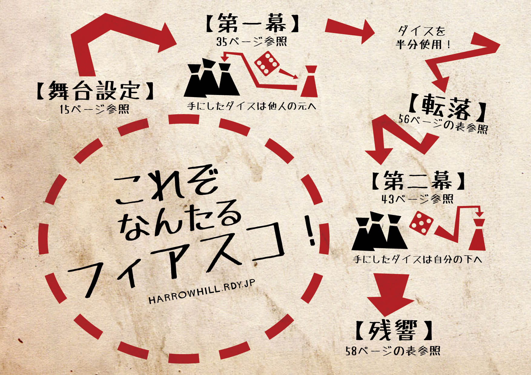 リファレンスシートを手元において、『フィアスコ』で順調に事故り続けましょう。プレイ中の進行手順に加えて、ダイスの置き場所も用意してあります。PDFには白黒版も同封していますが、やはり一番はカラーの方で、それも余力があればラミネート加工もオススメです!