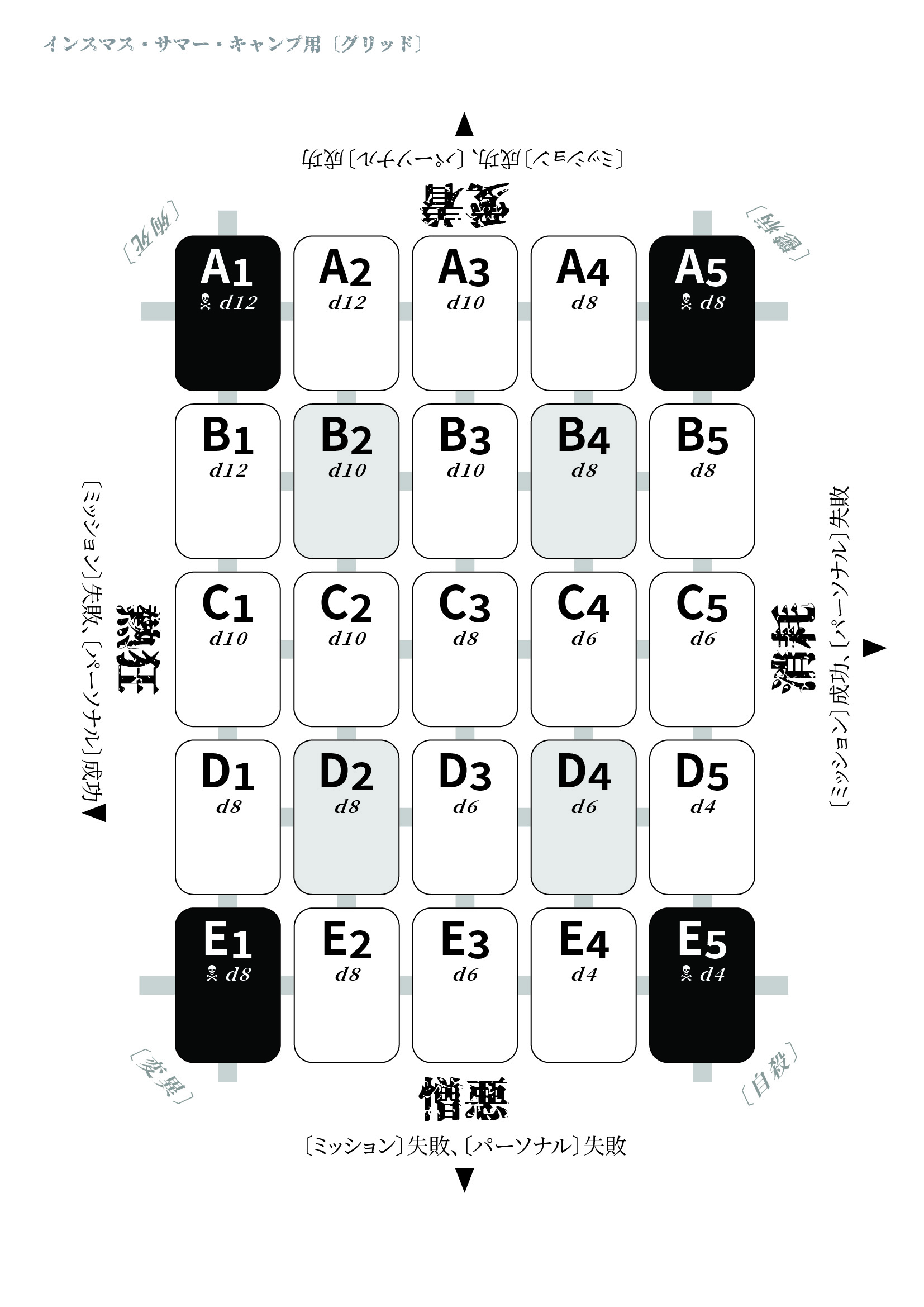 第二に、『青灰のスカウト』の〔グリッド〕は、プレイヤーにいくつもの恐ろしい結末をもたらすだけでなく、〔グリッド〕上の位置に応じて、テーマとなる要素をシーンにもたらす点です。