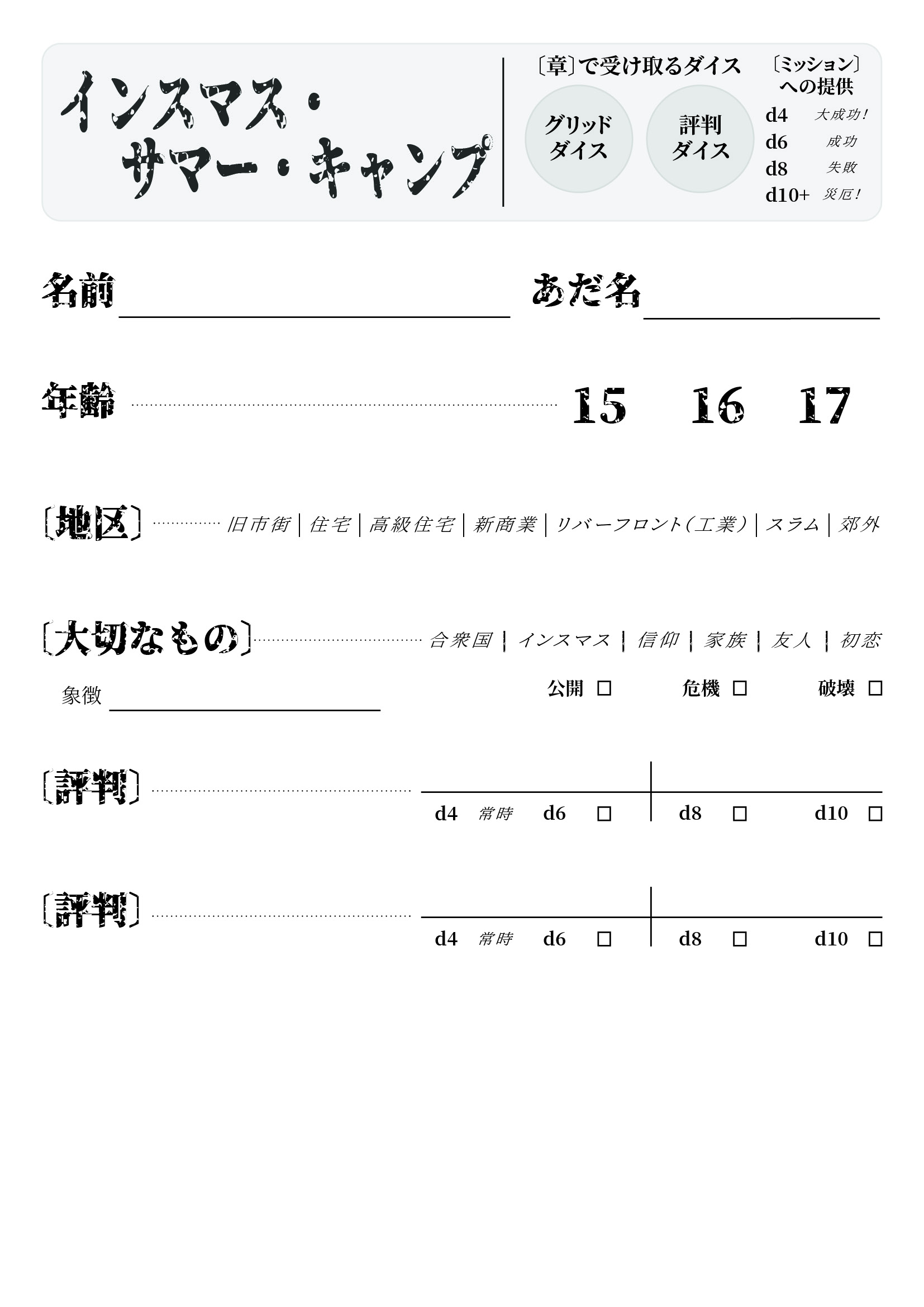 〔ミッション・シーン〕でダイスを提供する際、サイズの大きなダイス(d8以上)を出せばその〔シーン〕は成功となり、小さなダイス(d6以下)を出せば失敗となります。これは『青灰のスカウト』65ページに書かれているルールとは逆になります。標準ルールを使用しても構いませんが、このゲームではこの方法の方が効果的であることと判断しました。